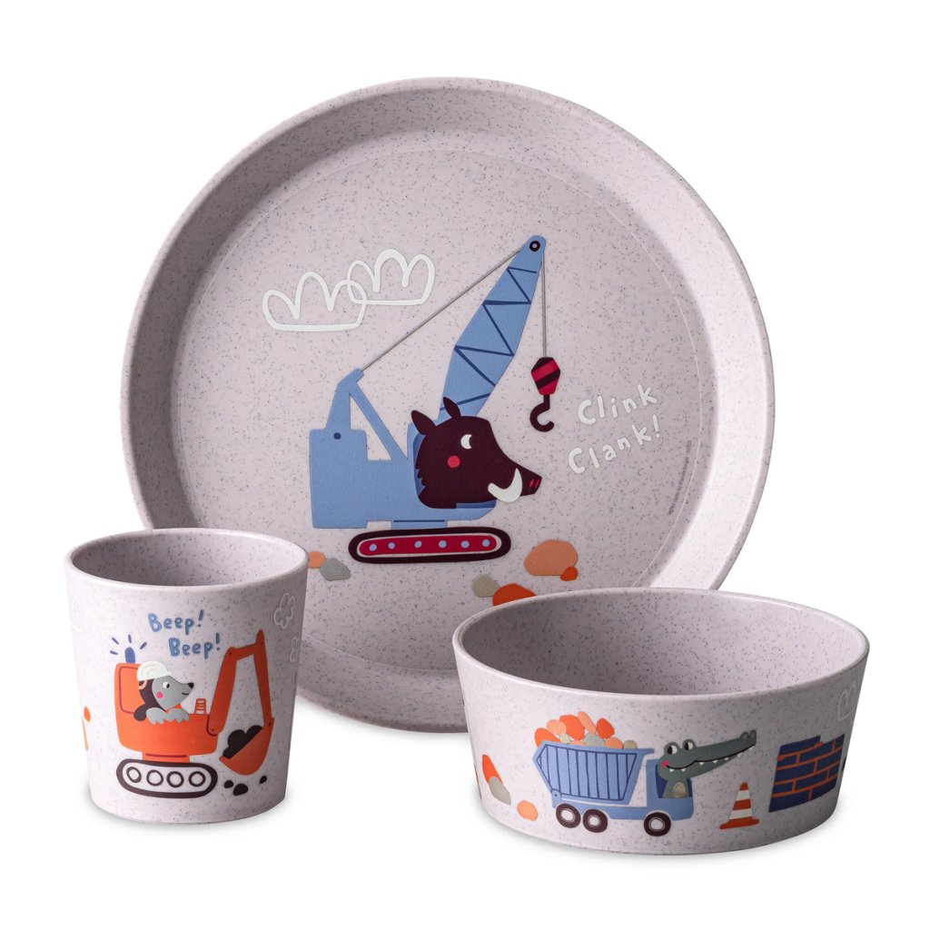 Detský jedálenský set s veselým motívom, navrhnutý pre malé ruky a veľké dobrodružstvá. Set obsahuje malý tanier, misku a pohárik. Tanier je ideálny na ovocie a zdravé snacky, miska sa rýchlo stane nevyhnutnosťou na müsli, kašu či malé jedlá a kompaktný pohárik sa výborne drží v detských rukách – zámerne bez uška.