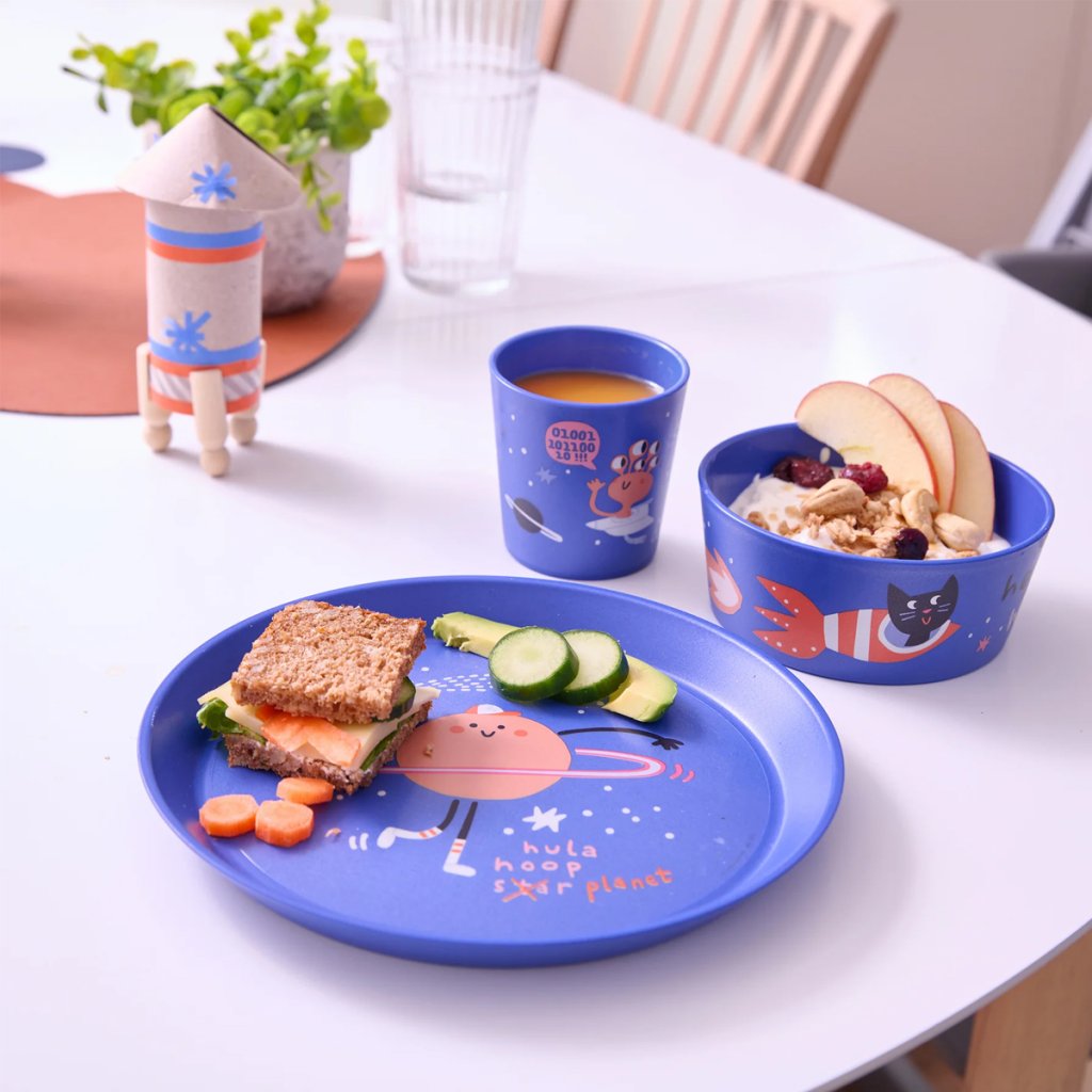 Detský jedálenský set s veselým motívom, navrhnutý pre malé ruky a veľké dobrodružstvá. Set obsahuje malý tanier, misku a pohárik. Tanier je ideálny na ovocie a zdravé snacky, miska sa rýchlo stane nevyhnutnosťou na müsli, kašu či malé jedlá a kompaktný pohárik sa výborne drží v detských rukách – zámerne bez uška.