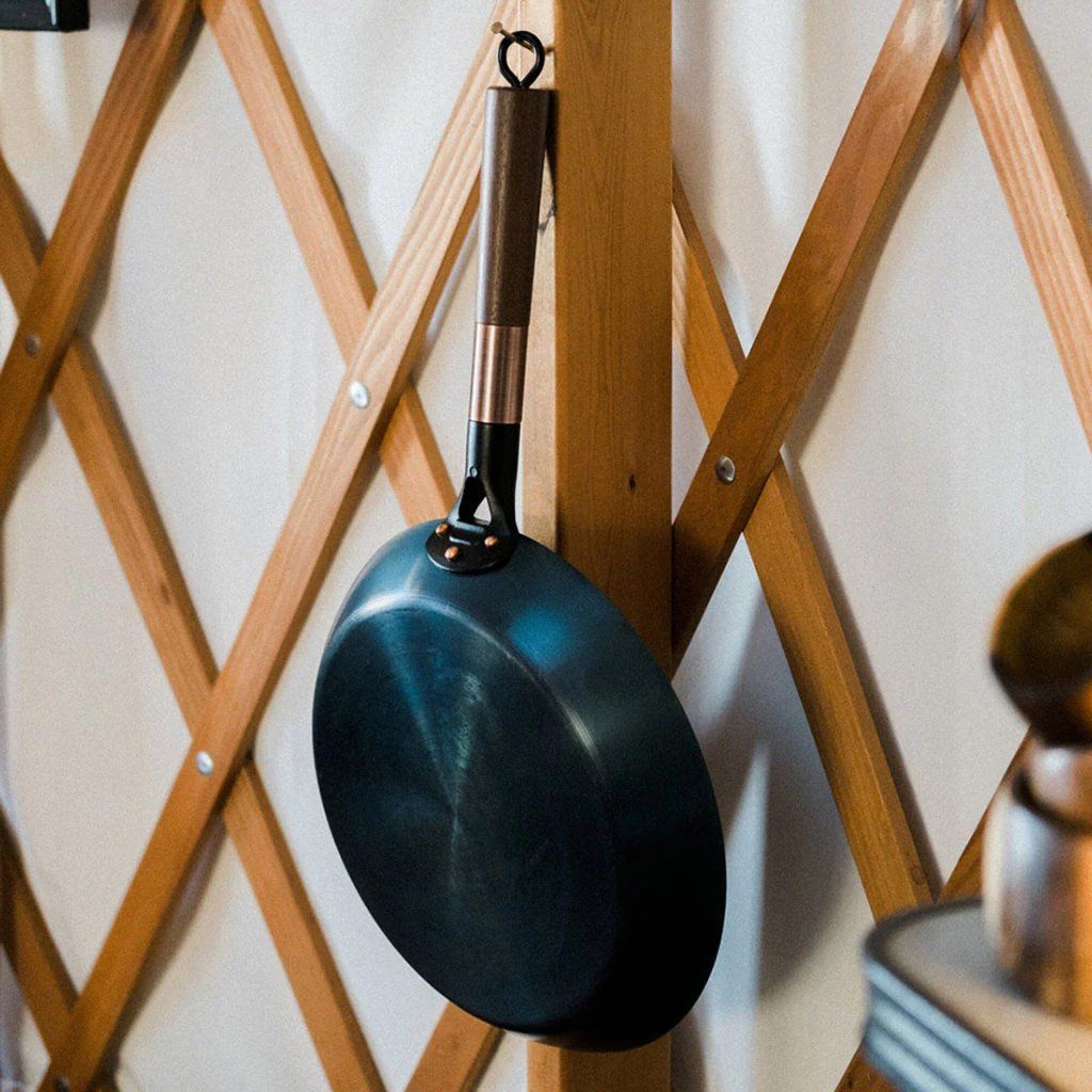 Panvica je vyrobená z uhlíkovej ocele s ručne modreným povrchom. Rýchlo sa nahrieva, dobre drží teplotu a vďaka odnímateľnej rukoväti z orecha sa ľahšie čistí aj skladuje. Pred prvým použitím ju treba vypáliť.